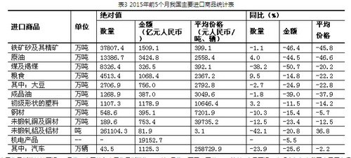 六、原油、粮食等主要大宗商品进口量增加,铁矿砂、煤、成品油进口量减少,主要进口商品价格普遍下跌。前5个月,我国进口铁矿砂3.78亿吨,减少1.1%,进口均价为每吨399.1元,下跌45.8%;原油1.34亿吨,增加4%,进口均价为每吨2558.4元,下跌46.6%;煤8326.4万吨,减少38.2%,进口均价为每吨392.1元,下跌20.2%;成品油1268.9万吨,减少1.8%,进口均价为每吨3049.6元,下跌37.9%;初级形状的塑料1107.3万吨,增加3.2%,进口均价为每吨1.06万元,下跌14.2%;钢材548.6万吨,减少10.3%,进口均价为每吨7201.9元,下跌5.7%;未锻轧铜及铜材189.6万吨,减少12.5%,进口均价为每吨3.97万元,下跌12.5%。 此外,进口粮食4513.4万吨,增加9.5%;其中大豆2706.9万吨,下降2.7%,进口均价为每吨2792.8元,下跌22.8%。机电产品进口1.92万亿元,下降5.5%;其中汽车43.5万辆,减少23.9%(表3)。
